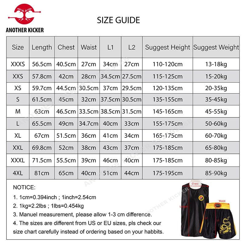 1. Versatile Sizing: Our Boxing Shorts and Singlet Set is available in a wide range of sizes to accommodate men, women, and kids of all ages and body types. This ensures a perfect fit for everyone, allowing them to perform at their best during training or competitions.